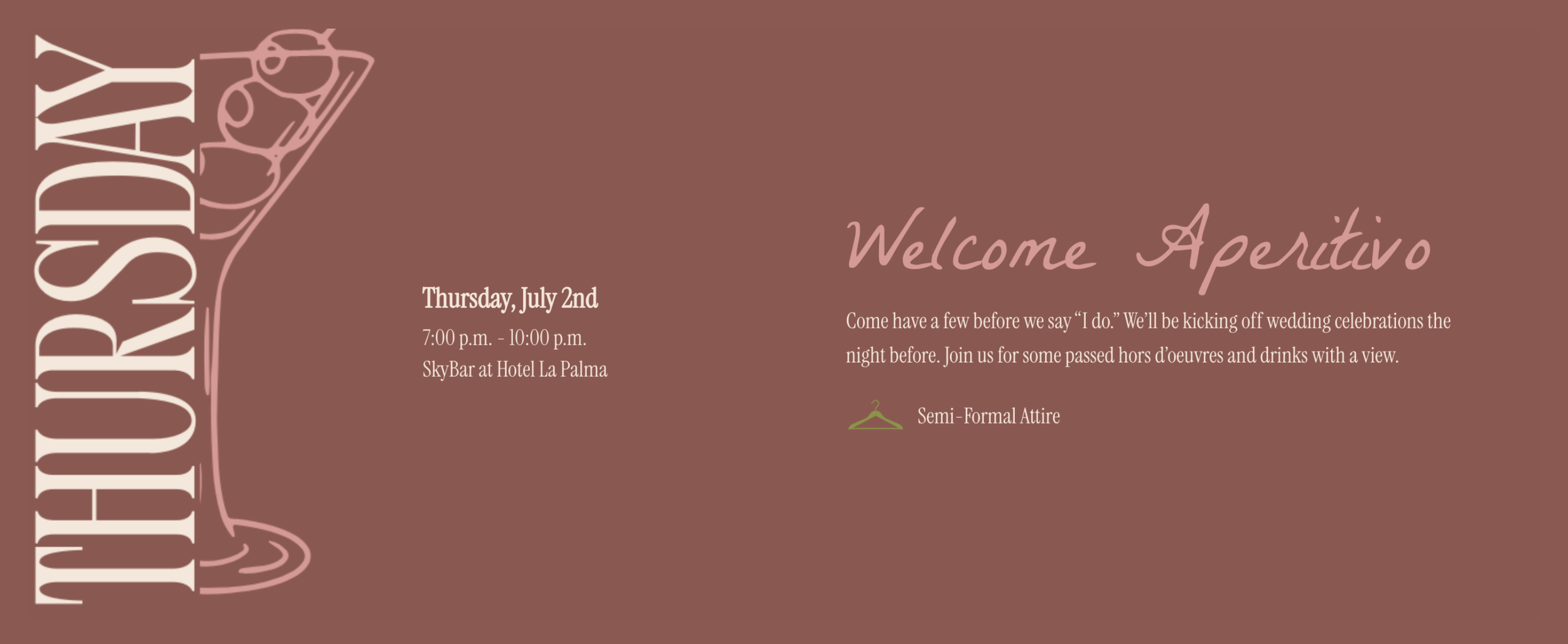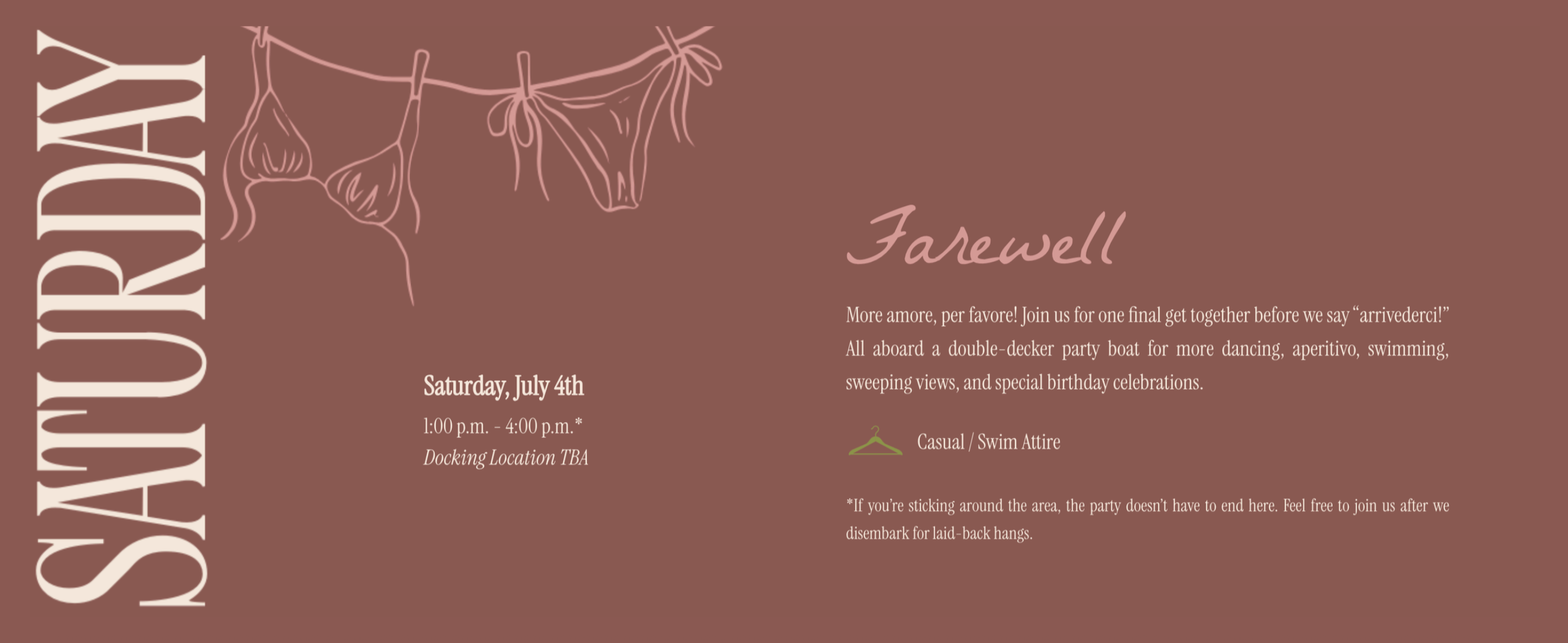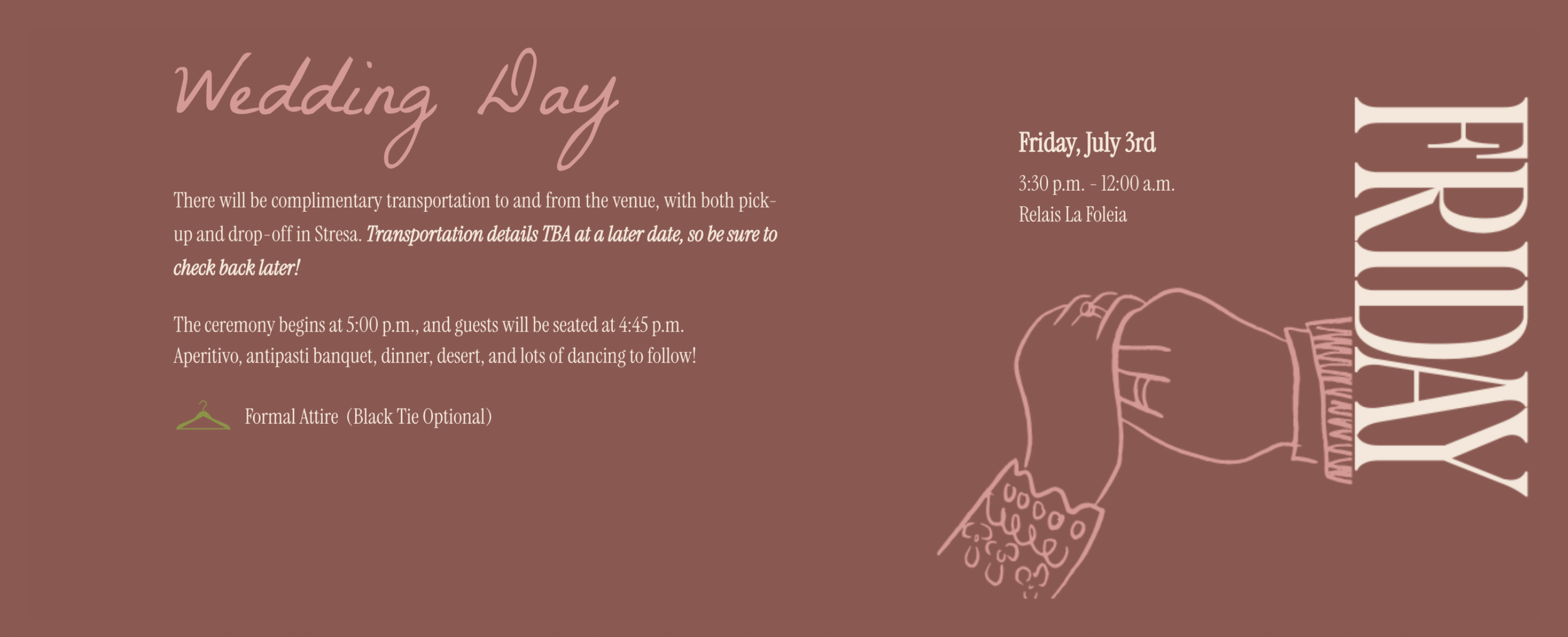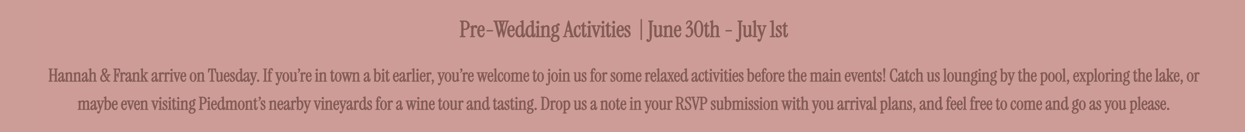 Hannah & Frank arrive on Tuesday. If you’re in town a bit earlier, you’re welcome to join us for some relaxed activities before the main events! Catch us lounging by the pool, exploring the lake, on a hike, or maybe even visiting Piedmont’s nearby vineyards for a wine tour and tasting. Drop us a note in your RSVP submission with you arrival plans, and feel free to come and go as you please!